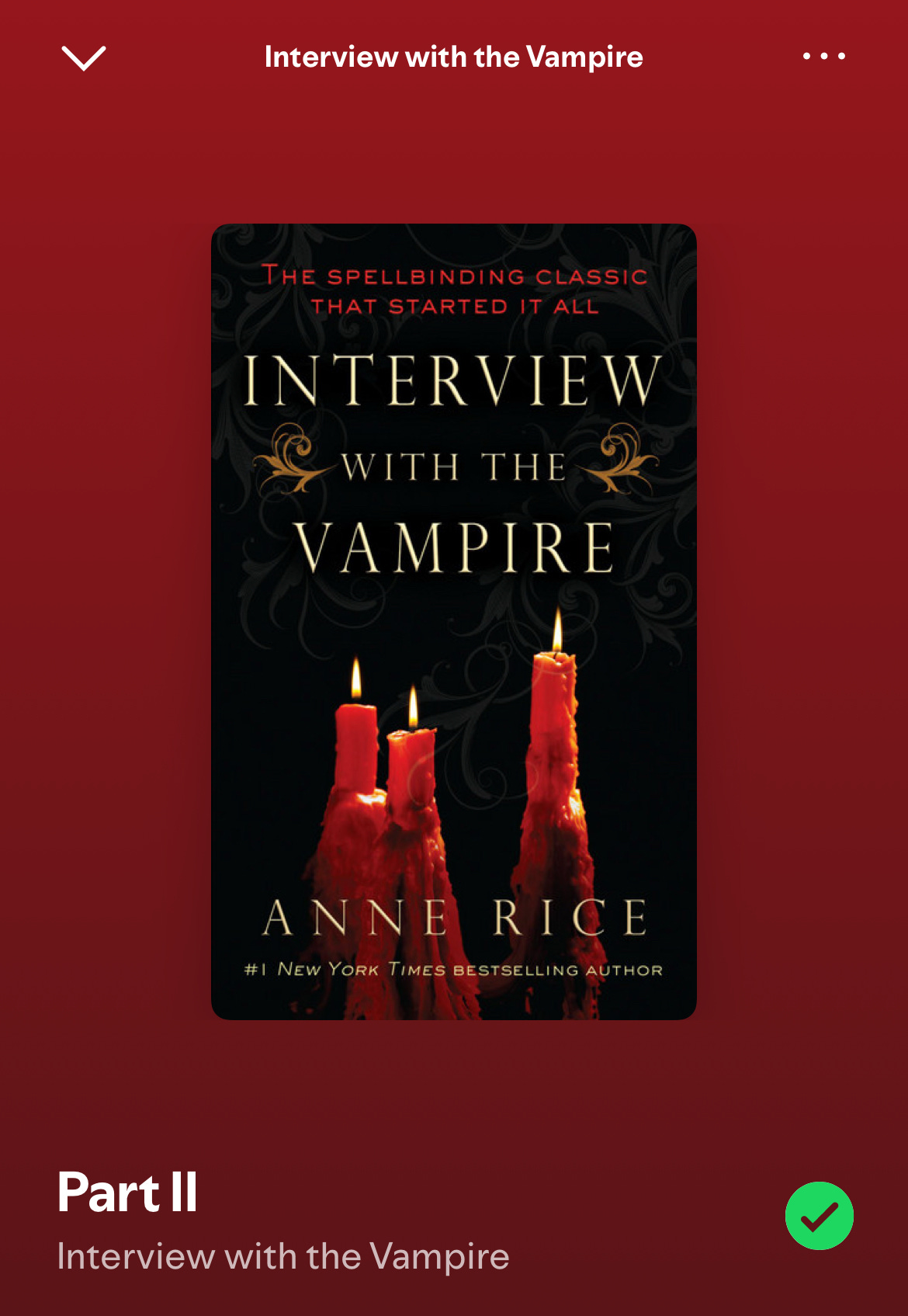 I | Intake — Reading Interview with the Vampire by Anne Rice! As a long-time vampire enthusiast, I am stoked to finally be diving into one of the most foundational texts of the genre. I mostly do audiobooks to keep me company on my commute, my runs & sometimes at work, depending on how mentally challenging work can be.
